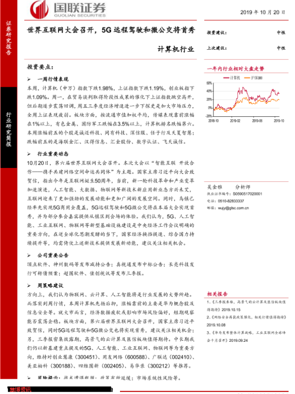 【国联证券】【20191020】计算机行业:世界互联网大会召开,5G远程驾驶和微公交将首秀-15页 行业研究