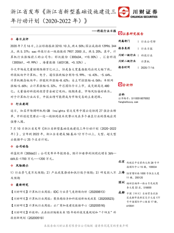【川财证券】【20200716】浙江省发布《浙江省新型基础设施建设三年行动计划(2020-2022年)》-3页 行业研究