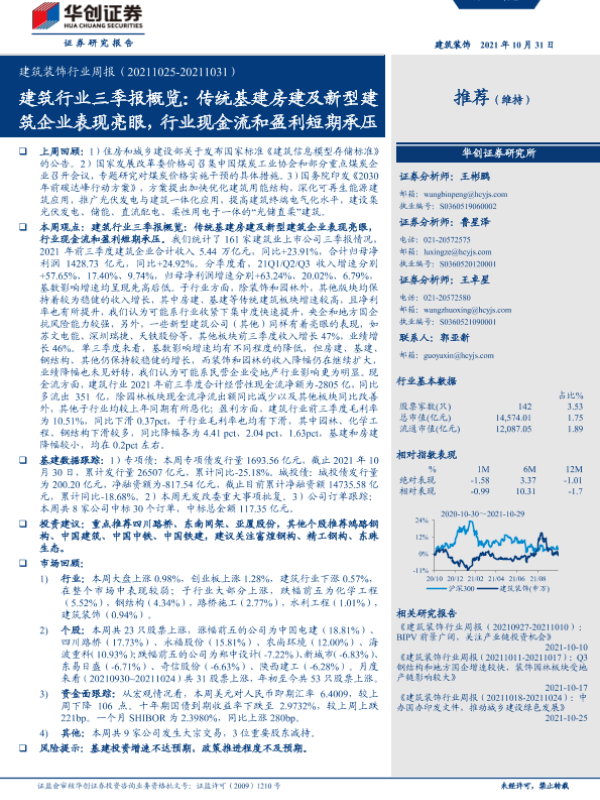 【华创证券】【20211031】建筑行业三季报概览:传统基建房建及新型建筑企业表现亮眼,行业现金流和盈利短期承压-24页 行业研究