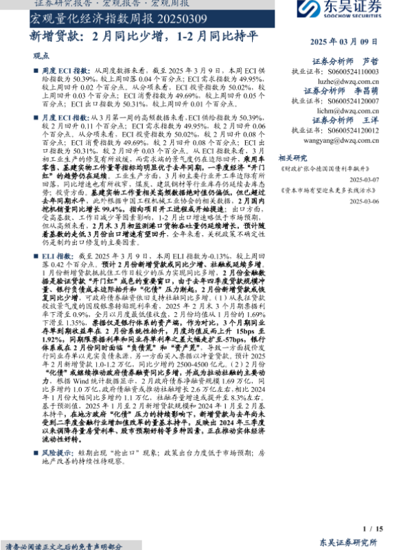 【东吴证券】【20250308】宏观量化经济指数周报:新增贷款,2月同比少增,1-2月同比持平-15页 宏观策略