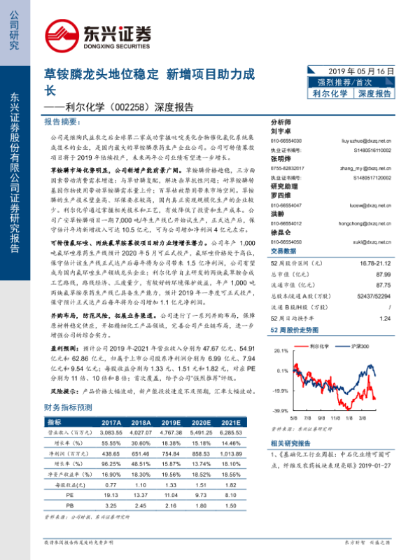 【东兴证券】【20190516】20190516-东兴证券-利尔化学-002258.SZ-深度报告:草铵膦龙头地位稳定 新增项目助力成长-22页 行业研究