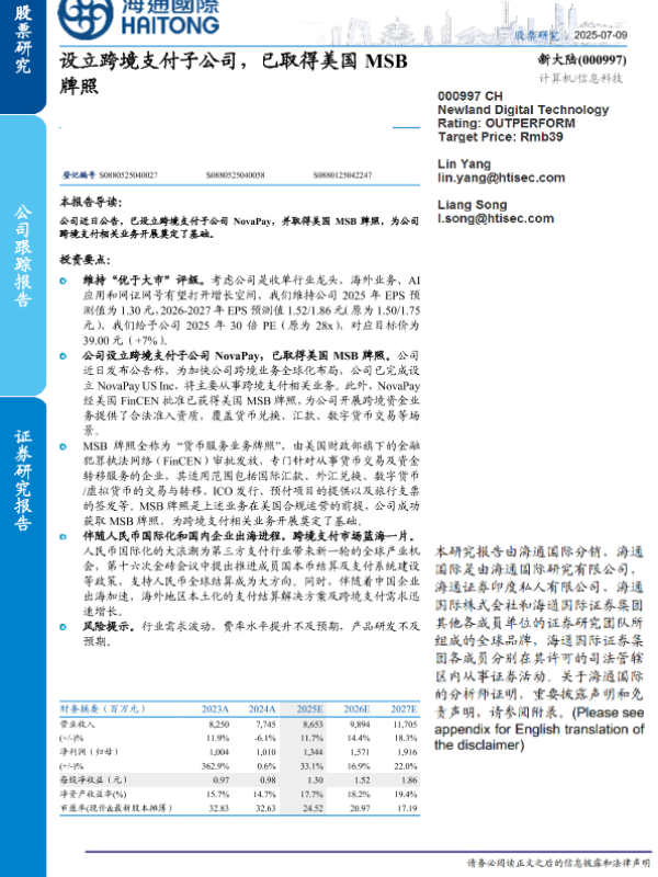 【海通国际】【20250702】新大陆(000997)设立跨境支付子公司,已取得美国MSB牌照-11页 证券期货研究报告