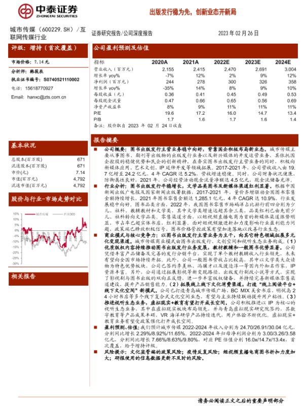 【中泰证券】【20230226】20230226-中泰证券-城市传媒-600229.SH-出版发行稳为先,创新业态开新局-30页 行业研究