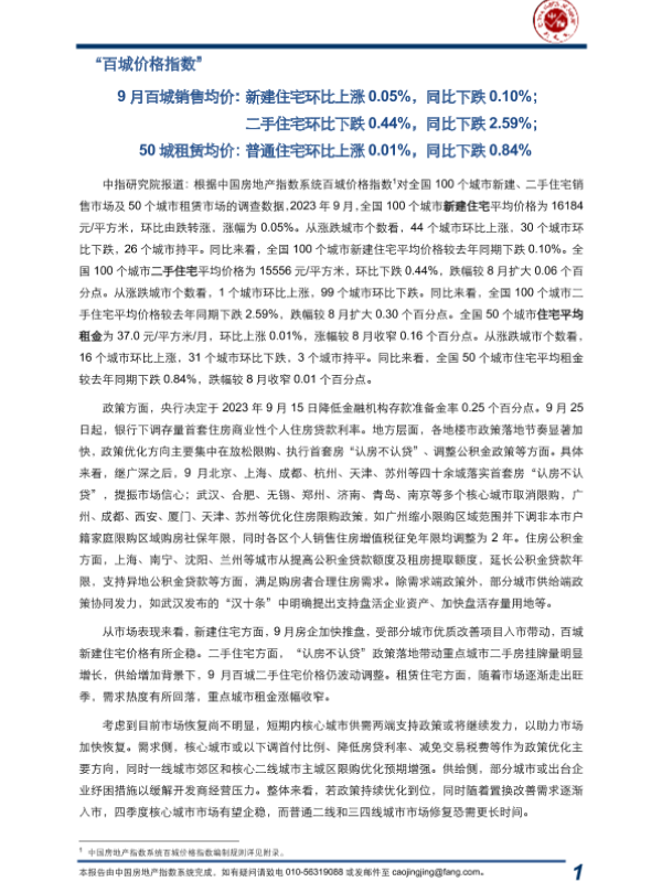 【中国房地产指数系统】【202309】2023年9月中国房地产指数系统“百城价格指数”报告-17页 行业研究