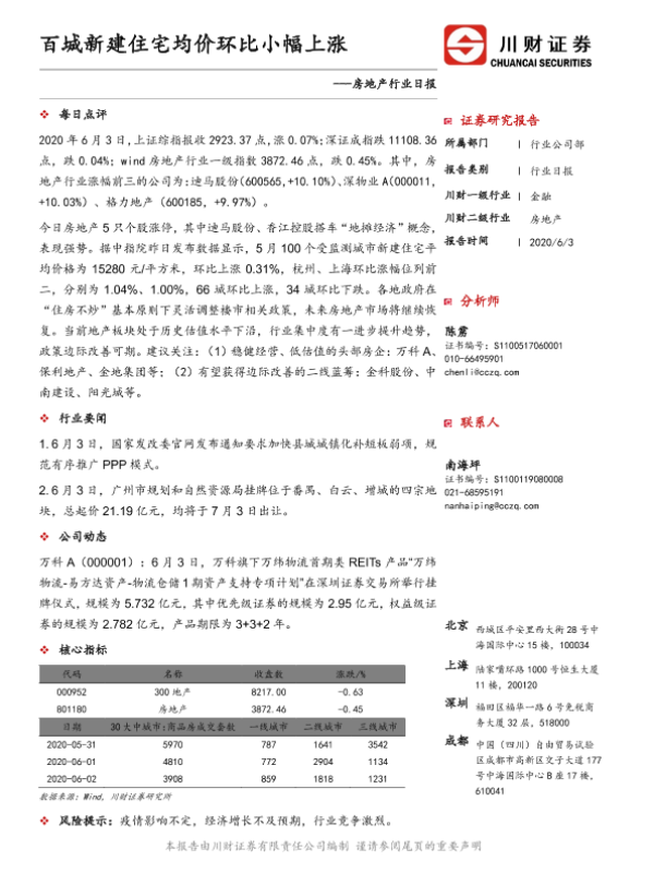 【川财证券】【20200603】百城新建住宅均价环比小幅上涨-3页 证券期货研究报告