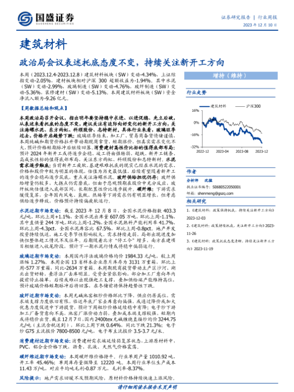 【国盛证券】【20231210】建筑材料行业周报:政治局会议表述托底态度不变,持续关注新开工方向-17页 行业研究