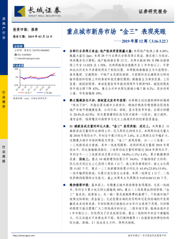 【长城证券】【20190324】房地产行业2019年第12周:重点城市新房市场“金三”表现亮眼-18页 行业研究