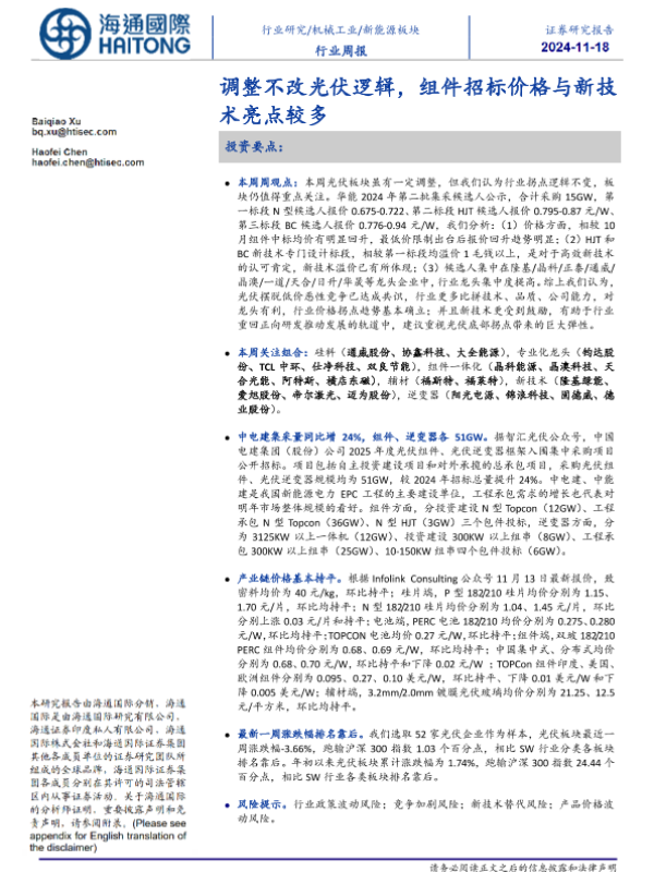 【海通国际】【20241118】20241118-海通国际-新能源板块行业周报:调整不改光伏逻辑,组件招标价格与新技术亮点较多-13页 行业研究