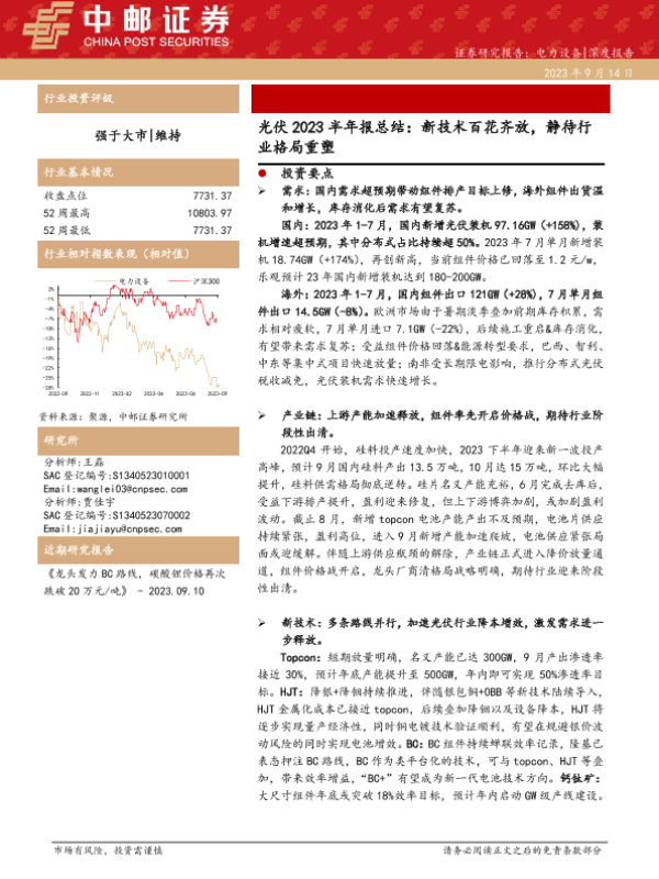 【上海证券】【20231019】光伏行业2023年半年报总结:成长与分化持续,新技术不断前行-20页 行业研究