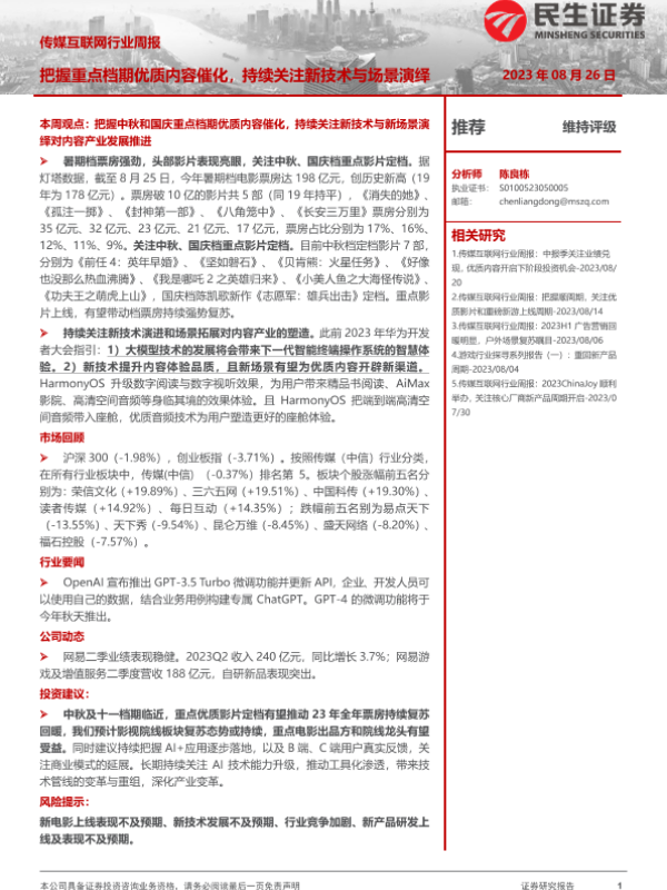 【民生证券】【20230826】传媒互联网行业周报:把握重点档期优质内容催化,持续关注新技术与场景演绎-21页 行业研究