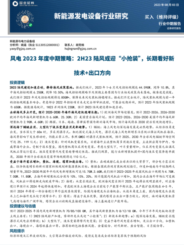 【国金证券】【20230803】风电2023年度中期策略:2H23陆风或迎“小抢装”,长期看好新技术+出口方向-28页 行业研究