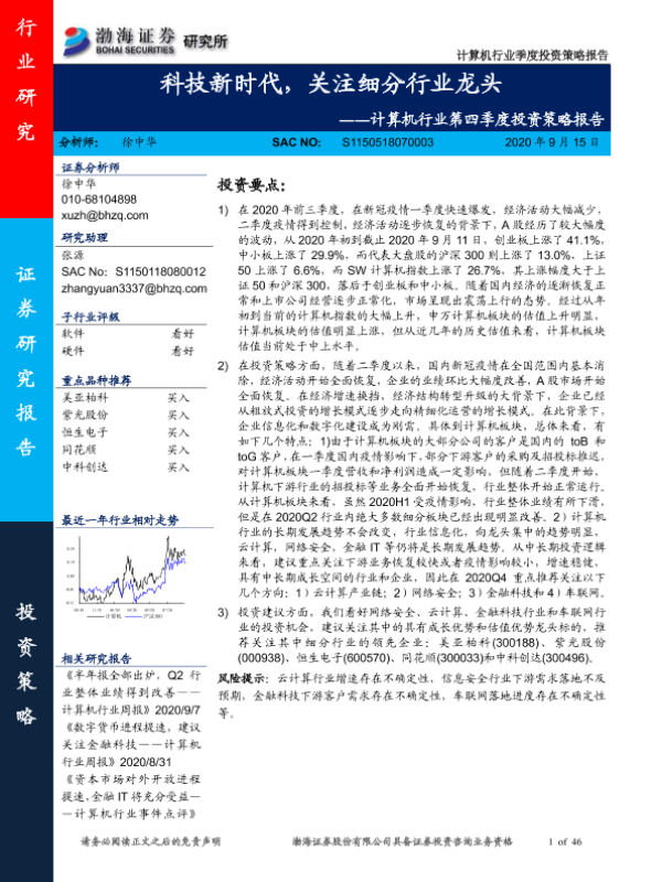 【渤海证券】【20200915】计算机行业第四季度投资策略报告:科技新时代,关注细分行业龙头-46页 行业研究