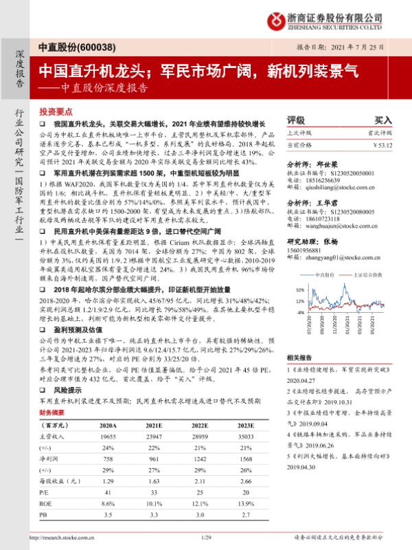 【浙商证券】【20210725】中直股份深度报告:中国直升机龙头;军民市场广阔,新机列装景气-29页 行业研究