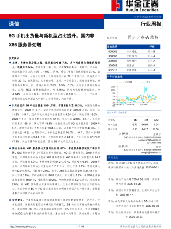 【华金证券】【20200614】通信行业周报:5G手机出货量与新机型占比提升,国内非X86服务器劲增-16页 行业研究