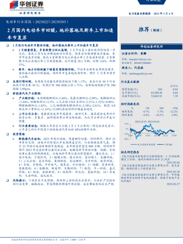 【华创证券】【20230306】电动车行业周报:2月国内电动车市回暖,地补落地及新车上市加速车市复苏-22页 行业研究