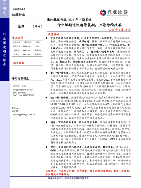 【兴业证券】【20210615】海外社服行业2021年中期策略:行业短期迎快速修复期,长期结构改善-39页 行业研究
