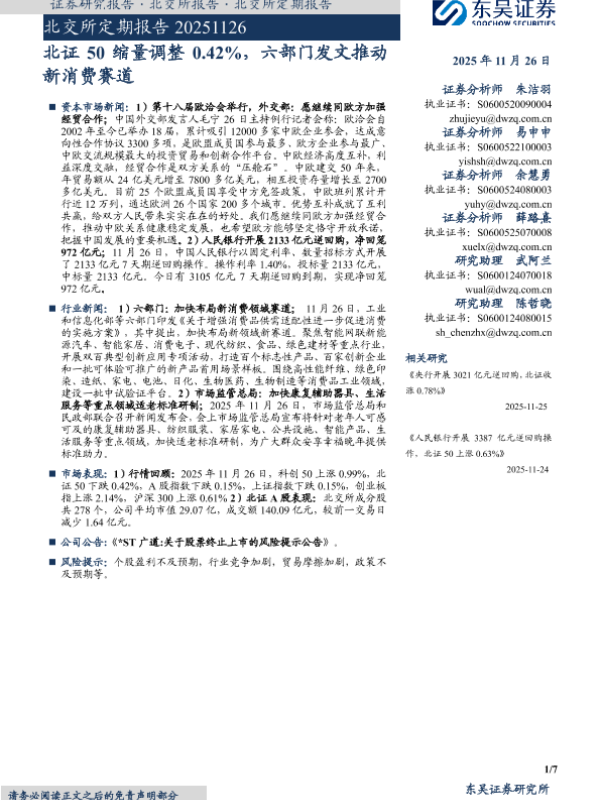 【东吴证券】【202511】北证50缩量调整0.42%,六部门发文推动新消费赛道-7页 证券期货研究报告
