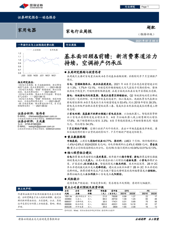 【国信证券】【20210705】20210705-国信证券-家电行业周报:基本面回顾&前瞻:新消费赛道活力持续,空调排产仍承压-10页 行业研究