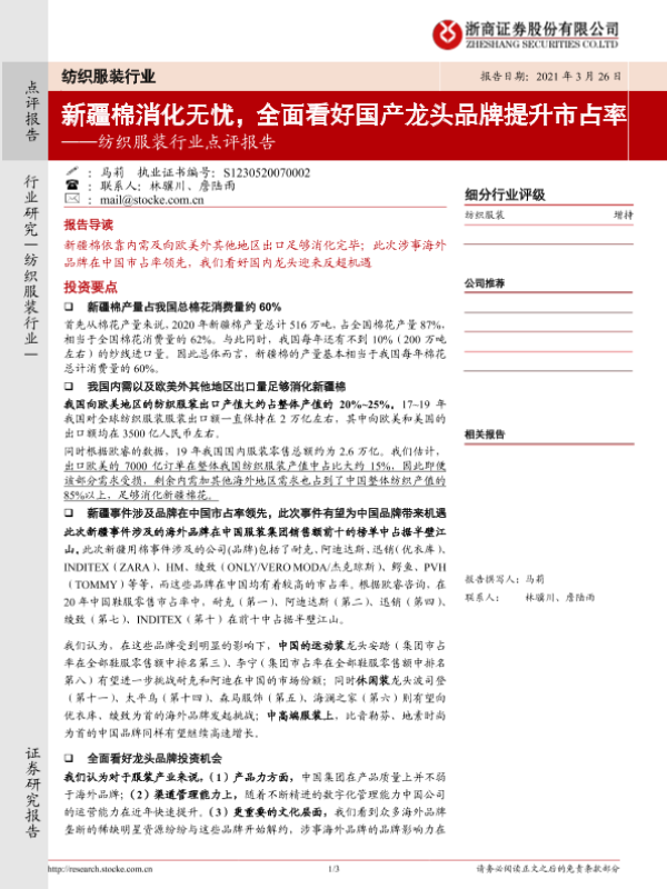 【浙商证券】【20210326】20210326-浙商证券-纺织服装行业点评报告:新疆棉消化无忧,全面看好国产龙头品牌提升市占率-3页 行业研究