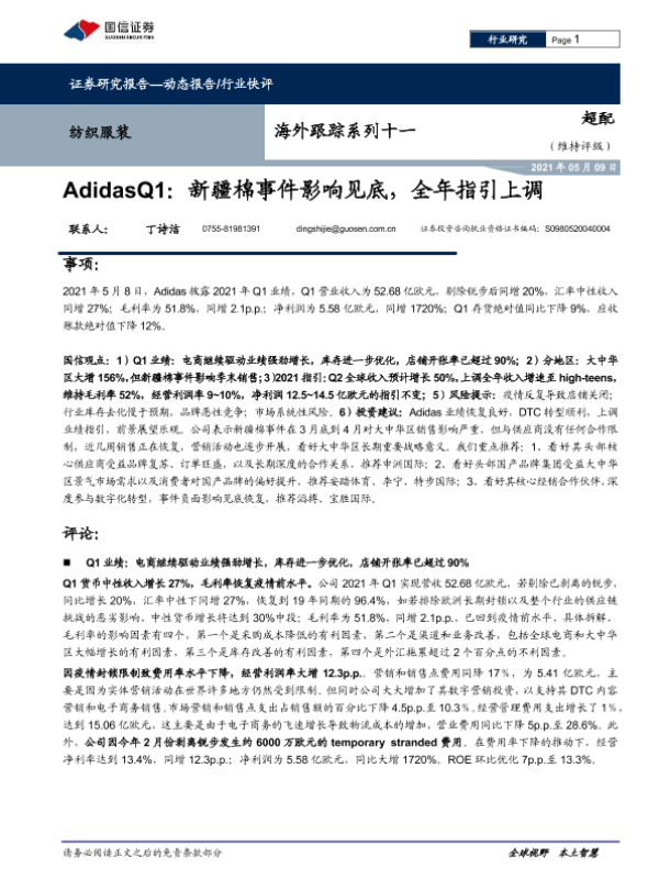 【国信证券】【20210509】纺织服装海外跟踪系列十一:AdidasQ1:新疆棉事件影响见底,全年指引上调-8页 行业研究