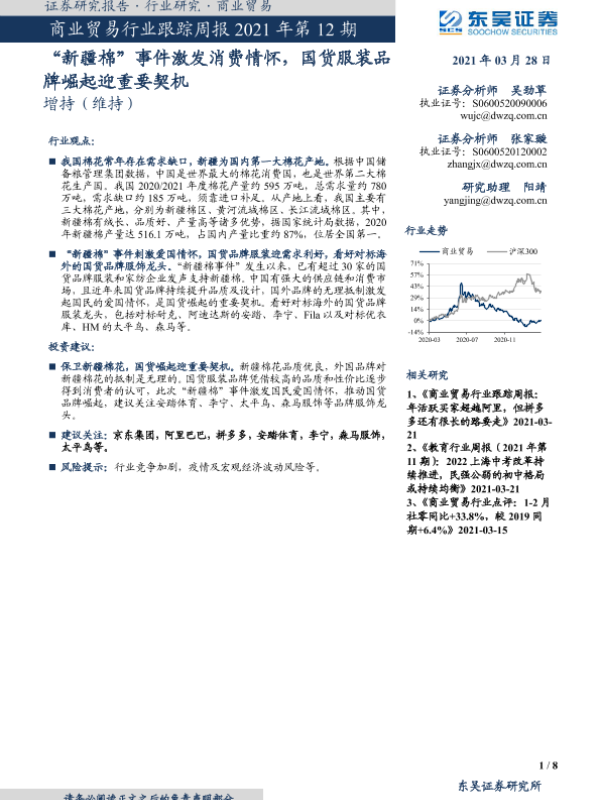 【东吴证券】【20210328】商业贸易行业跟踪周报:“新疆棉”事件激发消费情怀,国货服装品牌崛起迎重要契机-8页 行业研究