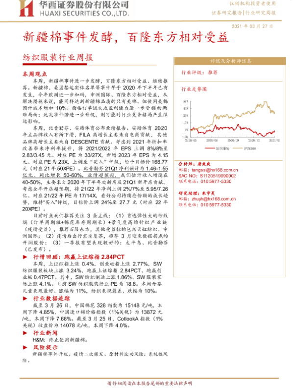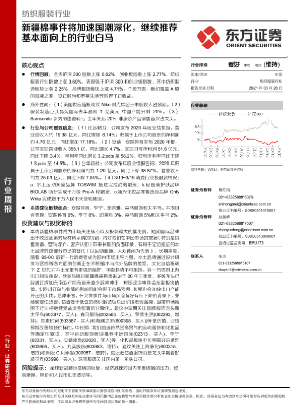 【东方证券】【20210328】纺织服装行业周报:新疆棉事件将加速国潮深化,继续推荐基本面向上的行业白马-9页 行业研究