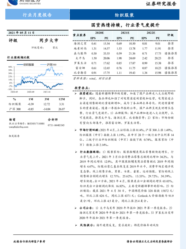 【财信证券】【20210511】20210511-财信证券-纺织服装行业月度报告:国货热情持续,行业景气度提升-12页 行业研究