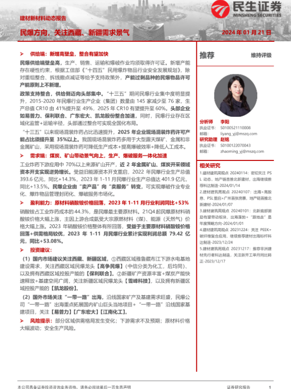 【民生证券】【20240121】建材新材料动态报告:民爆方向,关注西藏、新疆需求景气-16页 行业研究