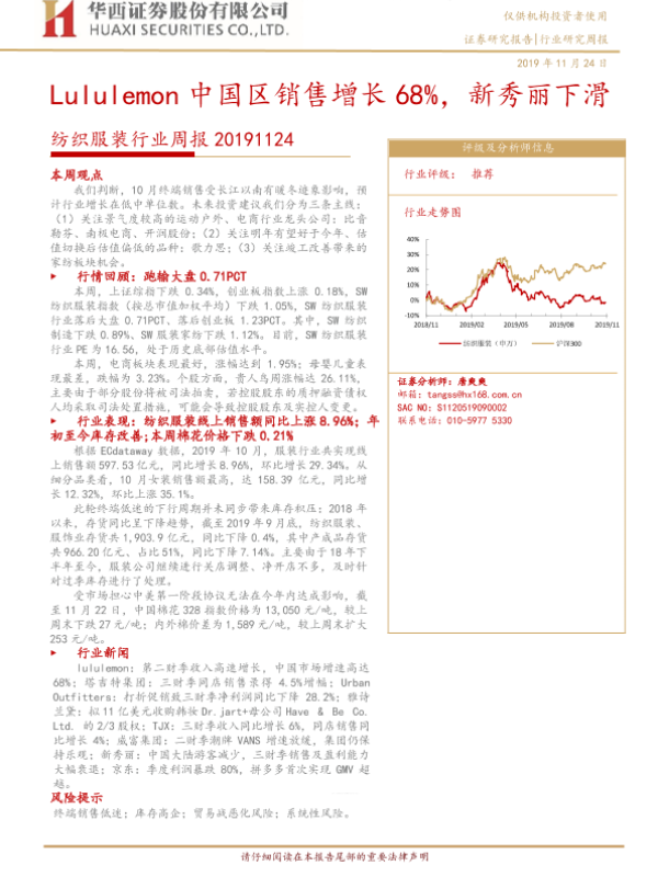 【华西证券】【20191124】纺织服装行业周报:Lululemon中国区销售增长68%,新秀丽下滑-15页 行业研究