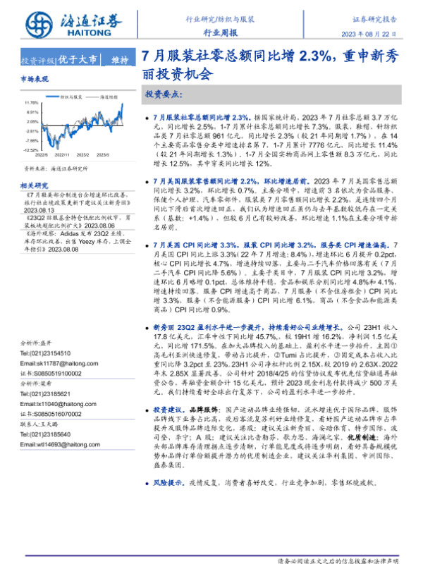 【海通证券】【20230822】20230822-海通证券-纺织与服装行业周报:7月服装社零总额同比增2.3%,重申新秀丽投资机会-11页 行业研究