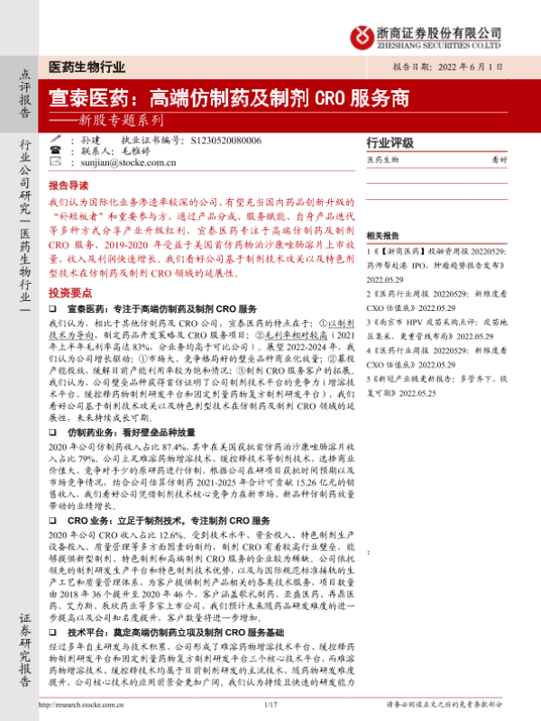 【浙商证券】【20220601】医药生物行业新股专题系列:宣泰医药,高端仿制药及制剂CRO服务商-17页 行业研究