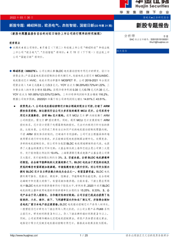 【华金证券】【20220330】新股专题:峰岹科技、欧圣电气、杰创智能、国能日新-25页 行业研究