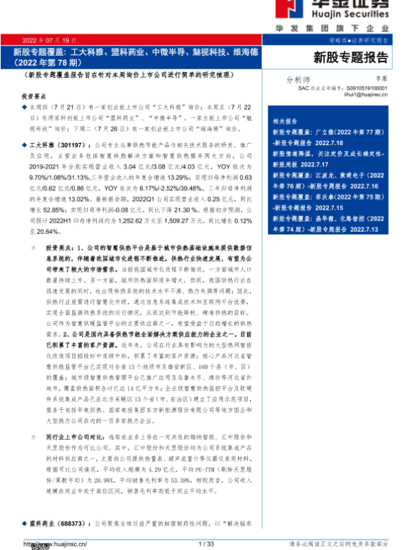 【华金证券】【20220719】新股专题覆盖:工大科雅、盟科药业、中微半导、魅视科技、维海德(2022年第78期)-33页 行业研究