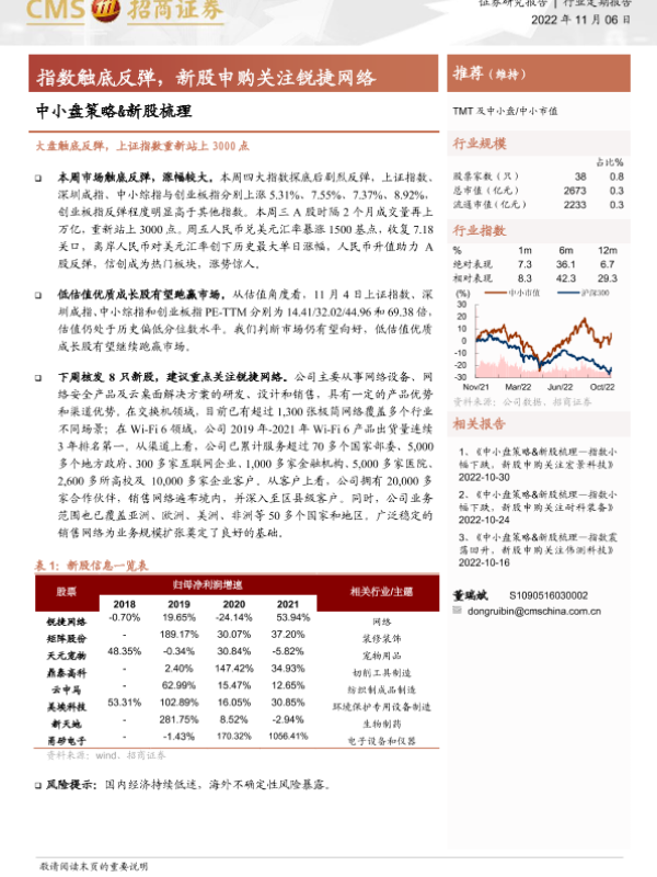 【海通证券】【20221106】中小盘策略&新股梳理:指数触底反弹,新股申购关注锐捷网络-16页 证券期货研究报告