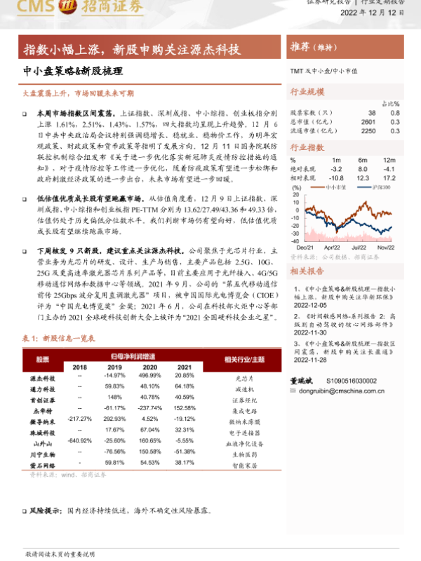 【海通证券】【20221212】中小盘策略&新股梳理:指数小幅上涨,新股申购关注源杰科技-20页 证券期货研究报告