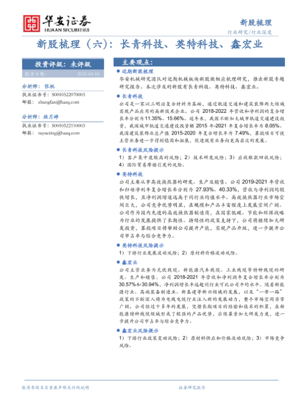 【华安证券】【20230410】20230410-华安证券-机械行业深度:新股梳理(六):长青科技、英特科技、鑫宏业-17页 行业研究