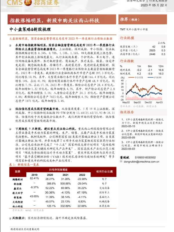 【海通证券】【20230522】中小盘策略&新股梳理:指数涨幅明显,新股申购关注西山科技-17页 行业研究