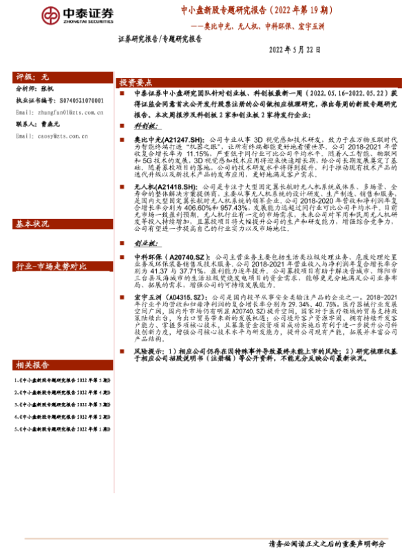 【中泰证券】【20220522】中小盘新股专题研究报告(2022年第19期):奥比中光、无人机、中科环保、宏宇五洲-23页 行业研究