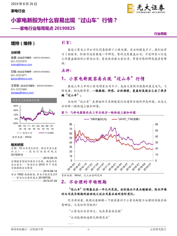 【光大证券】【20190825】家电行业每周观点:小家电新股为什么容易出现“过山车”行情?-7页 行业研究