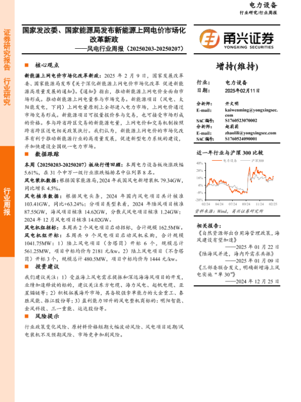 【甬兴证券】【20250211】风电行业周报:国家发改委、国家能源局发布新能源上网电价市场化改革新政-14页 行业研究