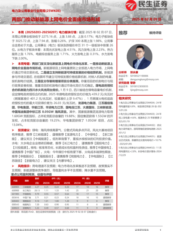 【民生证券】【20250209】电力及公用事业行业周报:两部门推动新能源上网电价全面由市场形成-18页 行业研究