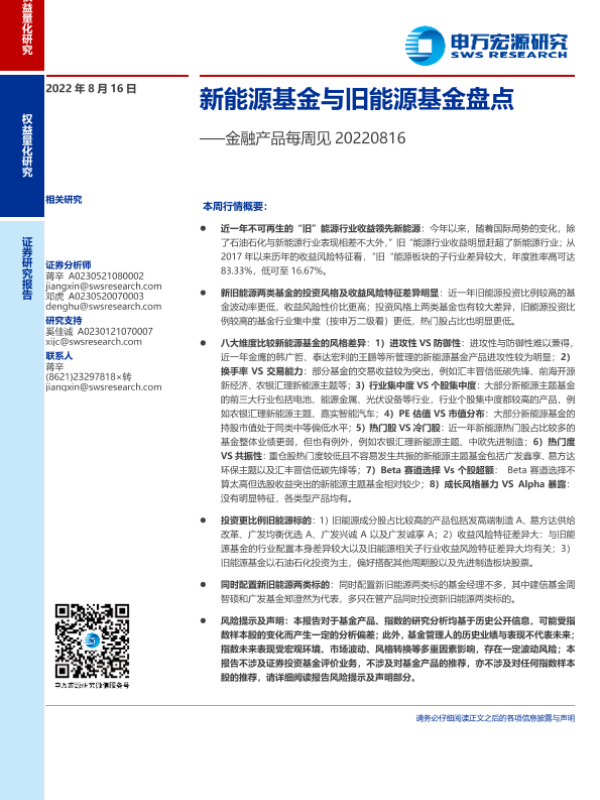 【申万宏源】【20220816】金融产品每周见:新能源基金与旧能源基金盘点-21页 行业研究