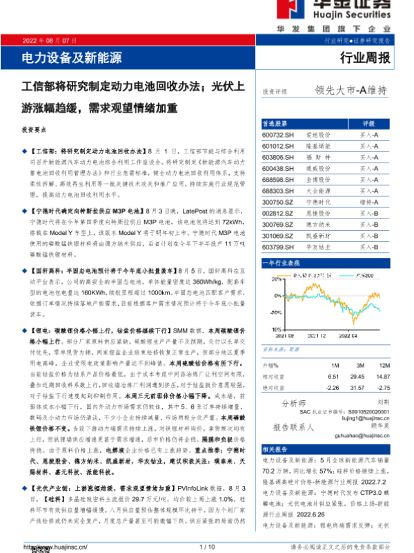 【华金证券】【20220807】电力设备及新能源:工信部将研究制定动力电池回收办法;光伏上游涨幅趋缓,需求观望情绪加重-10页 行业研究
