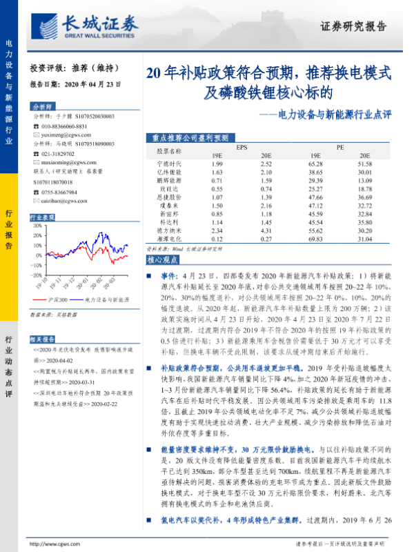 【长城证券】【20200423】电力设备与新能源行业点评:20年补贴政策符合预期,推荐换电模式及磷酸铁锂核心标的-3页 行业研究