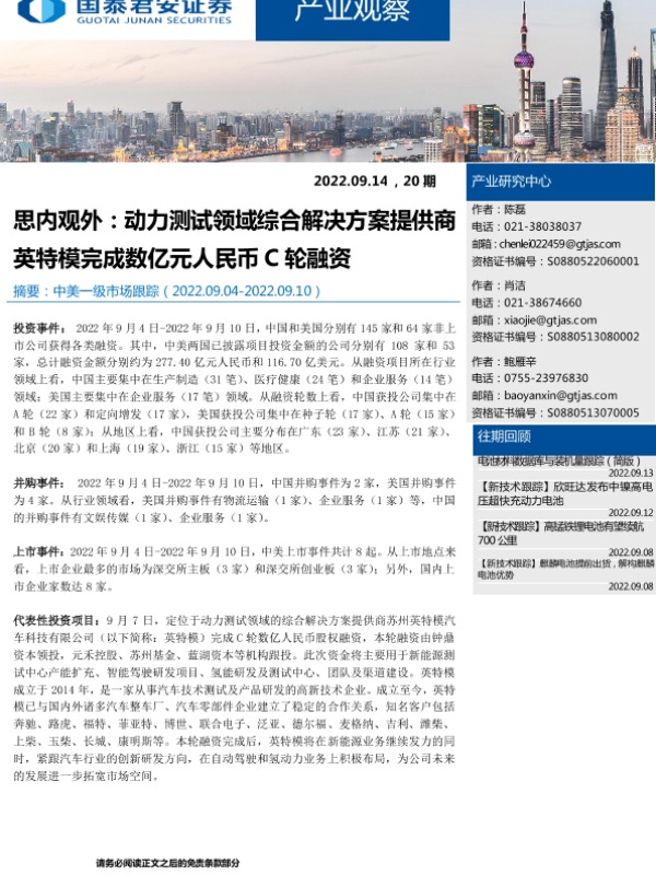 【国泰君安证券】【20220914】产业观察20期:思内观外,动力测试领域综合解决方案提供商,英特模完成数亿元人民币C轮融资-23页 行业研究