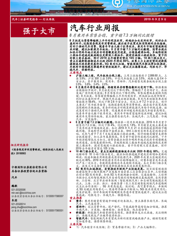 【中银证券】【20190909】20190909-中银证券-汽车行业周报:8月乘用车零售企稳,重卡销7.3万辆同比微增-20页 行业研究