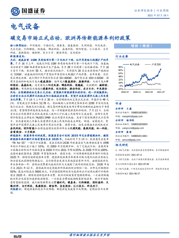 【国盛证券】【20210718】电气设备行业周报:碳交易市场正式启动,欧洲再传新能源车利好政策-14页 行业研究