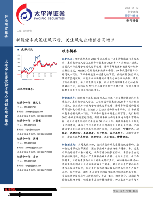 【太平洋证券】【20200112】20200112-太平洋-电气设备行业周报:新能源车政策暖风不断,关注风电业绩预告高增长-18页 行业研究