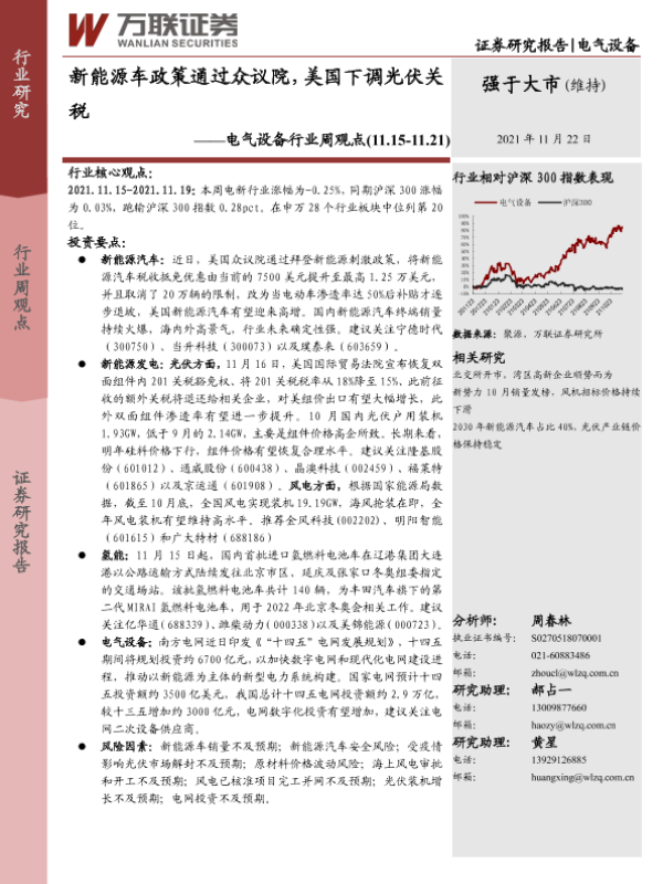 【万联证券】【20211122】电气设备行业周观点:新能源车政策通过众议院,美国下调光伏关税-12页 行业研究