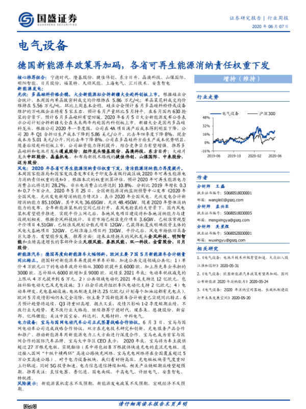 【国盛证券】【20200607】电气设备行业周报:德国新能源车政策再加码,各省可再生能源消纳责任权重下发-14页 行业研究